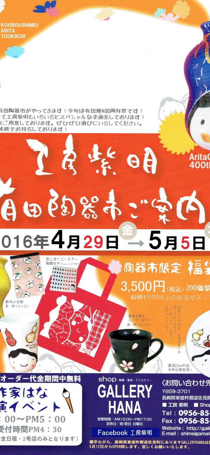Home ニュース 今年も有田陶器市、工房紫明2号店にて出張営業します♪ 今年も有田陶器市、工房紫明2号店にて出張営業します♪ 2016.04.18 ニュース Post Share Hatena Pocket RSS feedly Pin it 今年もいよいよやってきます!有田陶器市♪今年も工房紫明2号店にて出張コラボしますよぉ! 皆様是非是非ご来場お待ちしてます♪ この機会にはな先生による手書きの実演を是非ご覧になってお気に入りのお品を見つけてくださいね(^^) はーとらんどのメニューのご紹介も近日中に公開します! 招待状がキッチンはーとらんどに置いてあります! お分け出来ますので、お気軽にお声をかけてくださいね♡ 師匠?? Post Share Hatena Pocket RSS feedly Pin it